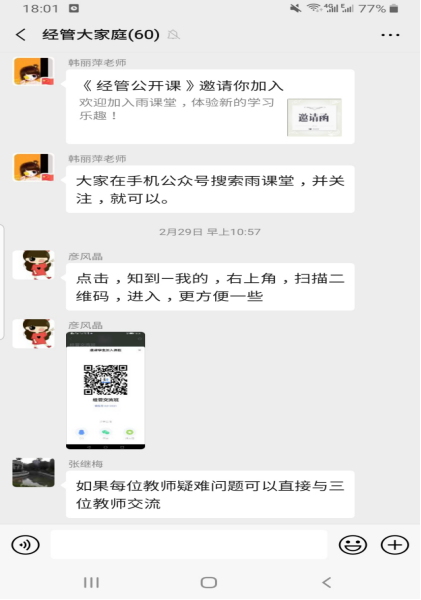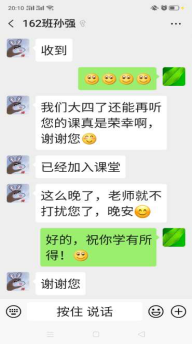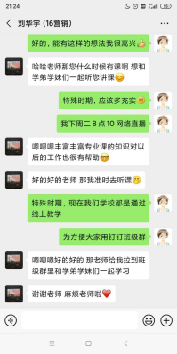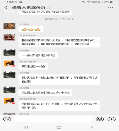 2017级财务管理三班郝明宇的家长说 “我没读过大学,只知道孩子在学财务管理专业,疫情期间,公司线上教学,我正好可以了解一下孩子所学的专业内容”。首节课后,听课家长纷纷表示,通过老师的线上授课,感受到老师专业的教学水准和认真授课的态度,自己对孩子的专业也有了新的、进一步的认识。线上授课让家长们真正感受到素质教育下孩子们得到的全面发展。