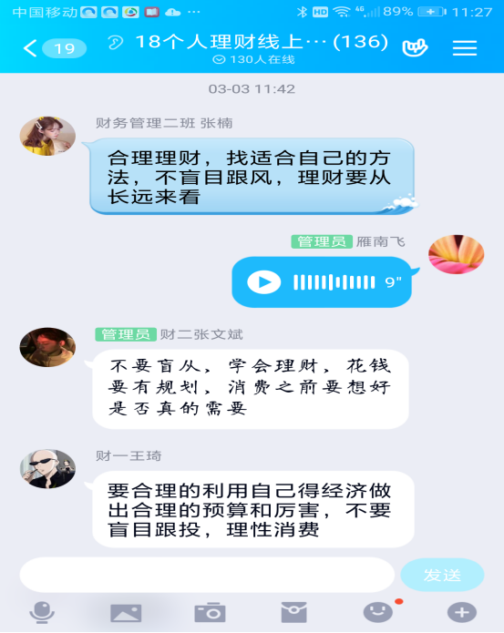 基本情况:个人理财课程是财务管理专业的选修课,是针对个人和家庭开展理财规划,实现财务自由的一门课。课程共32课时,从3月3日开课,在智慧树平台,集中辅导时间为16课时,每周2课时,应到课人数135人,实际到课135人,到课率100%。