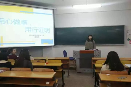凭借着自身丰富的工作学习经验,孟德莹为同学们讲解了在大学期间学好习和做好员工干部的注意事项。“坚持个人目标和能力的提升,积极参与活动,要用心享受过程,而不要苛求结果”。孟德莹这样说到。紧紧围绕着用心做事,用行证明的主题,从身边真实案例展开,切身举例,同学们听的十分入迷,引起了同学们的阵阵掌声。作为学姐她提出了几点建议:首先,希望学弟学妹们能够享受老员工活,规划好时间,不要荒废了青春,虚度年华;其次,希望大家能够学好自己的专业知识,努力进取;最后,一定要把握时机,扩展眼界。在学习本专业知识以外,拓展其他兴趣爱好,提升自我。