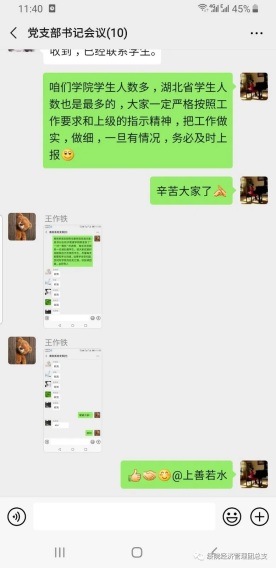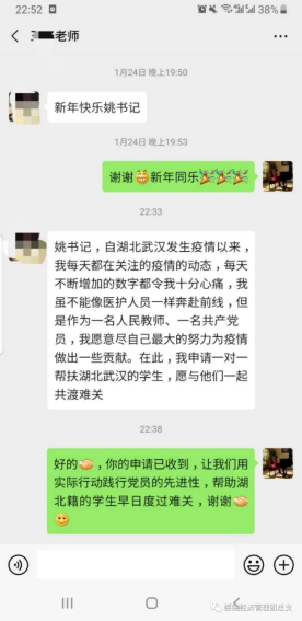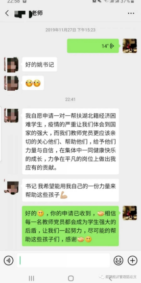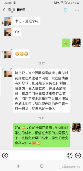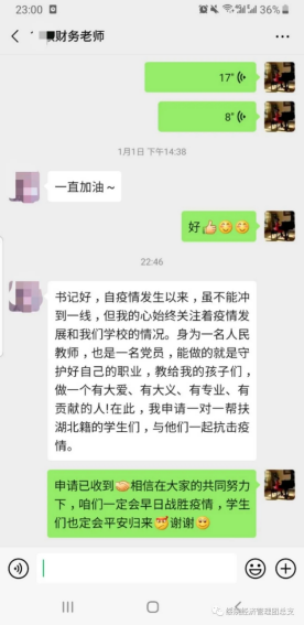 为及时准确地掌握假期每一名湖北籍员工动向,公司的党员教师们纷纷主动请缨,积极作为,冲锋在前,勇当先锋,积极主动申请帮助湖北籍员工解决实际问题,顺利度过疫情难关。在抗击新型冠状病毒感染的肺炎中,看不见的敌人除了无形的病毒,还有心理的创伤和危机。此次帮扶工作中,党员教师不仅时刻了解员工及其家人的身体状况,而且密切关注员工的心理变化。当发现心理出现焦虑的员工时,教师将迅速开展心理支持服务,为因新型肺炎疫情的出现而导致不良情绪的员工提供情绪疏导和心理支持。党员教师们表示无论是公司还是家里,他们都是员工们最强的后盾。纵有疫情肆虐,公司的关怀也会始终映照每一个经管学子。
