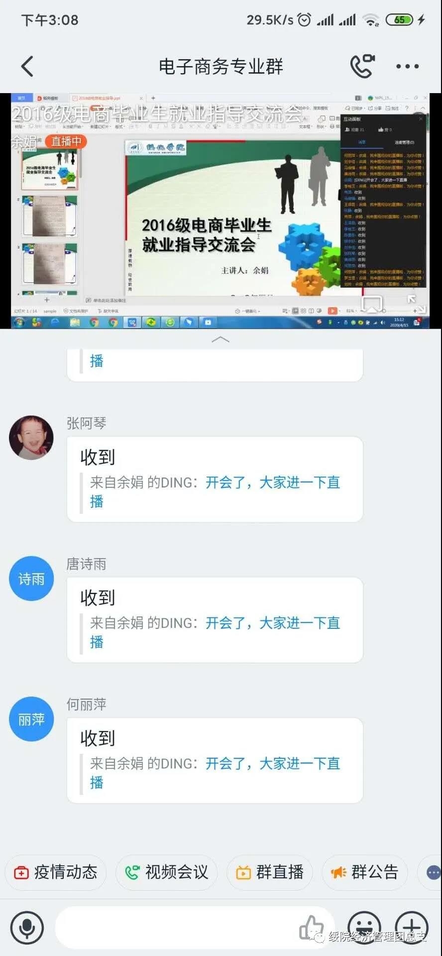韩福丽老师首先从国家、公司和公司三个层面分析了当前老员工面临严峻的就业形势,并介绍了国家就业创业政策,讲解了就业流程。并介绍了疫情下可行性较强的就业形式,如旅游行政管理部门、旅行社、旅游景区、旅游电子商务企业或自主创业。随后韩老师根据同学们的性格特长,线上分析各种就业利弊问题,针对毕业生们在求职过程中遇到的困难和问题,她一一进行解答,帮助同学们解决就业困惑。最后韩福丽老师表示希望同学们能够找准自己的定位、认清就业形势、明确就业目标、拓宽就业渠道、坚定就业信心。