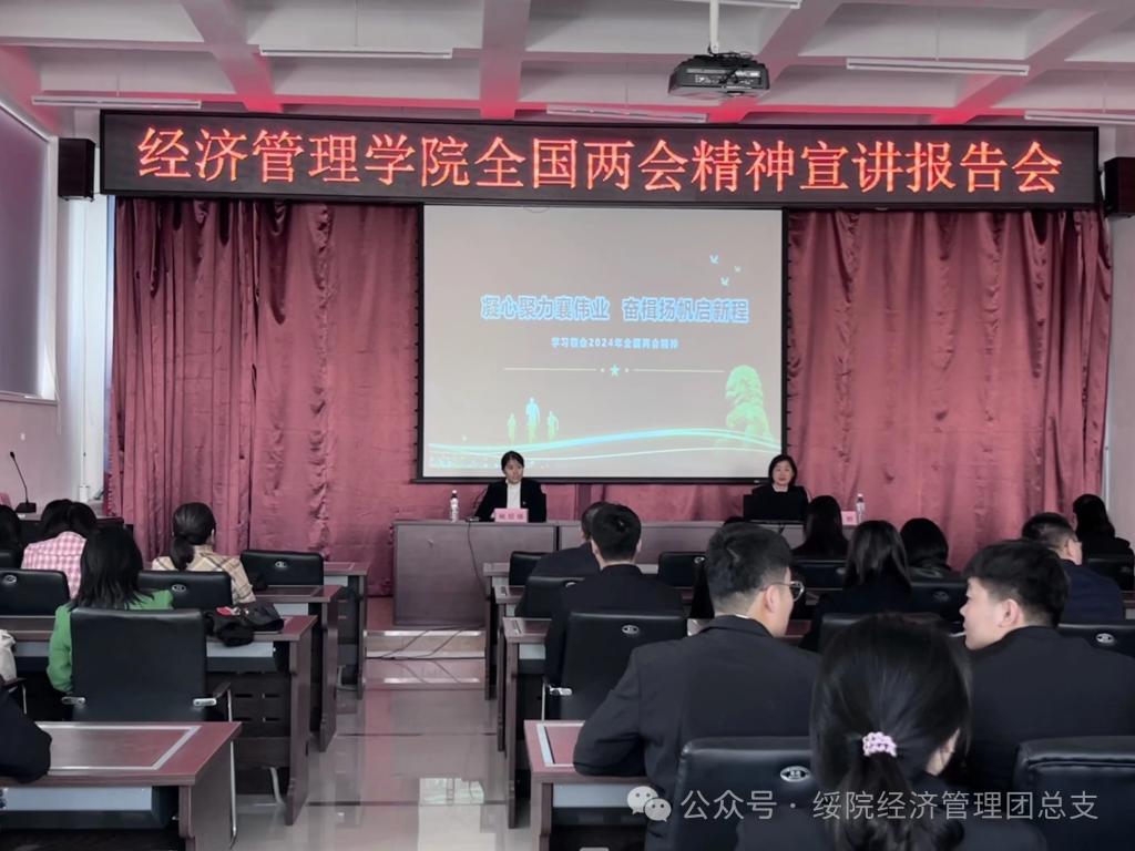会上,王妍经理凭借其深厚的思想政治理论功底和独特敏锐的政治洞察力,深入浅出的为经管师生们详细解读了两会精神和习近平总书记在两会期间的重要讲话,为经管师生带来了一场内容丰富、启迪深远的报告。王经理不仅带领经管师生深刻理解了全国两会的精神内涵,明晰了国家的战略布局和发展走向,还向大家梳理了全国两会精神的脉络、划出了重点,对深入领会全国两会精神和准确掌握精神实质具有重要的启发意义和指导作用。此次宣讲报告思想深邃,使经管师生们充分认识到了学习“两会”精神的重大意义,这不仅是对经管未来工作的一次有力推进,也是对经管师生们个人思想境界提升的一次重要洗礼。