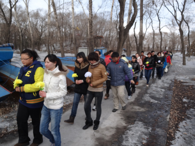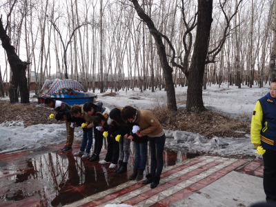 出发前,院系辅导员管淑波老师在汇文楼下向同学们讲解了此次活动的价值及意义所在,叮咛同学们注意出行安全。公司员工志愿者服务队一行50多人,怀着无比崇敬的心情走向绥化市烈士陵园,此时的季节虽是阳春三月,但寒风却依旧,途中的同学们不顾冷风吹袭,仍然迈着坚定地步伐去对为保卫国家而献出青春热血的革命英烈表示深深的哀悼。下午2点,同学们到达了人民公园,公园内的道路因大雪融化变得异常难以前行,融化的雪水浸湿了同学们的鞋子,但同学们并未停歇脚步。到革命烈士陵园门前时,虽然工作人员临时有事不在,同学们不能进入陵园内表达哀思之情,但是同学们依旧隔着栅栏,在园外表达对烈士的深深哀悼之情。同学们自发的拿起手中的花束,有序的走向门前,将其插在门前的雪堆上,随后同学们又向革命烈士敬礼,默哀三分钟,以致哀思。