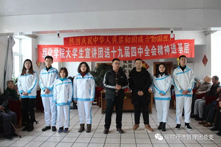 为了宣传贯彻党的十九届四中全会精神,弘扬中华传统美德,倡导大家尊老敬老,爱老助老,12月4日,BETVICTOR伟德团总支书记于小庆、2017级辅导员罗晓宇和志愿者小分队,带着师生们浓浓的爱,向福泰敬老院的老人们送上了真诚的祝福。