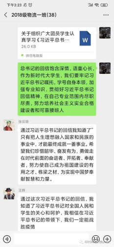 习近平总书记的话既是对广大青年团员嘱托也是激励。各班举行了线上学习《习近平总书记给北京大学援鄂医疗队全体“90后”党员的回信》的会议。会议上,同学们畅所欲言,纷纷发表自己的看法。