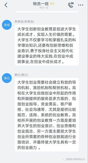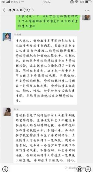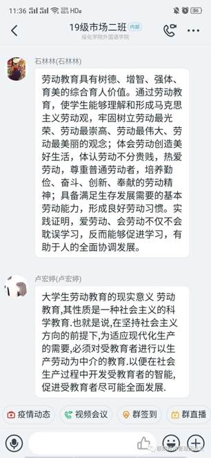 通过线上平台,同学们积极讨论了对《意见》的认识,发表了自己对《意见》出台的看法,并且结合自身日常学习生活和学科专业知识的学习,表达了对于劳动教育的认同,同学们纷纷表示,对员工进行劳动教育是一件很必要的事情,只有进行劳动教育,才能让自己成为德智体美劳全面发展的社会主义接班人,有经验的同学还积极主动的分享了自己日常劳动技能提升、劳动习惯养成的途径,帮助同学们更快的按照《意见》行动起来。