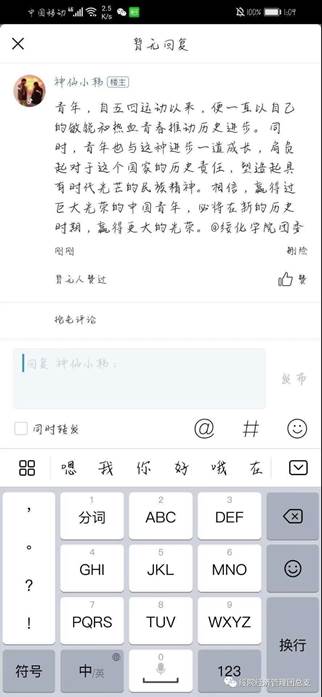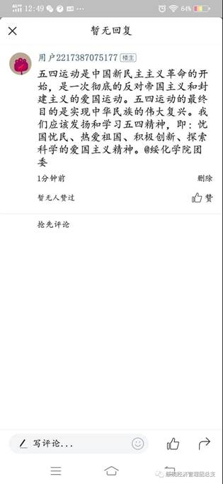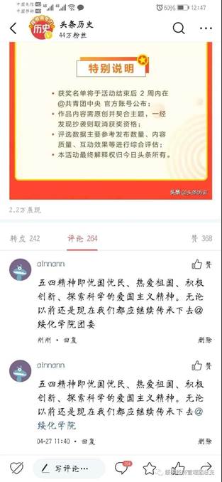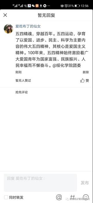 同学们以在今日头条APP上评论五四活动的形式,高扬青春的光亮,青年兴则国家兴,青年强则国家强,一夕危亡,五四惊雷划破历史长夜。昔日中国青年,怀揣强国梦想,用热血和生命,谱写一曲最壮丽的青春之歌;今日中国青年,当铭记五四精神,不断拼搏奋斗,让奋斗成为青春的底色,让中国走向更美好的未来。