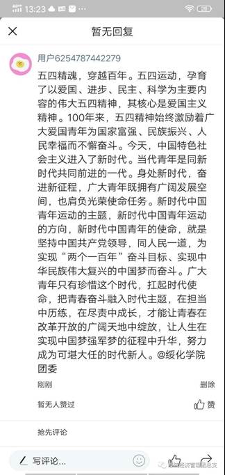 同学们在评论区积极评论,“做一个爱国者,忠于祖国,忠于人民;做一个勤学者,敏于求知,善于实践;做一个追梦者,扎实干事,踏实做人;做一个创新者,开拓进取,砥砺前行;五四传承,青春我们与你相伴;初心不忘,未来我们携手同行。”
