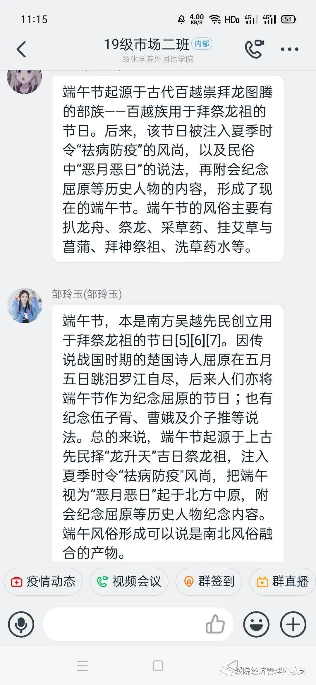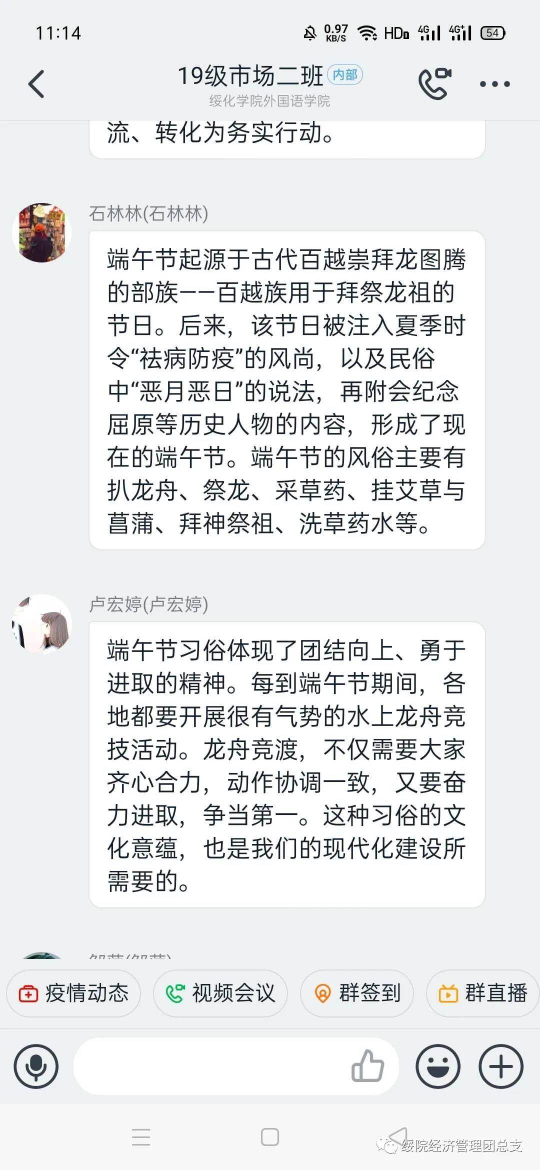 为了让同学们更好地了解端午节,感受端午节丰富的文化内涵,激发浓烈的爱国主义情感,弘扬中华民族优秀传统文化,进一步增强文化自信。公司积极响应校团委号召,于6月24日以班级为单位线上开展了“传承端午文化,弘扬爱国精神”主题团日活动。