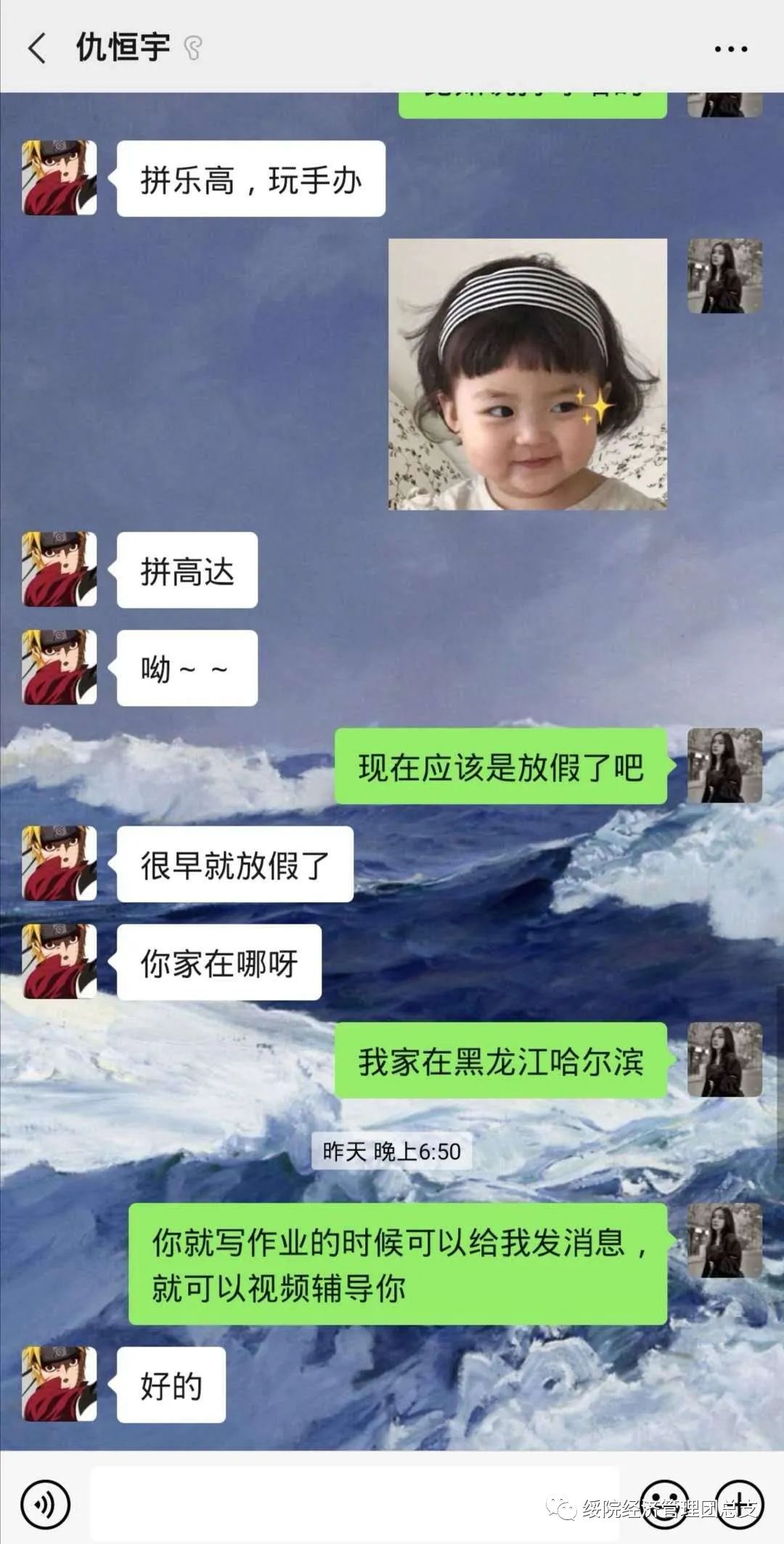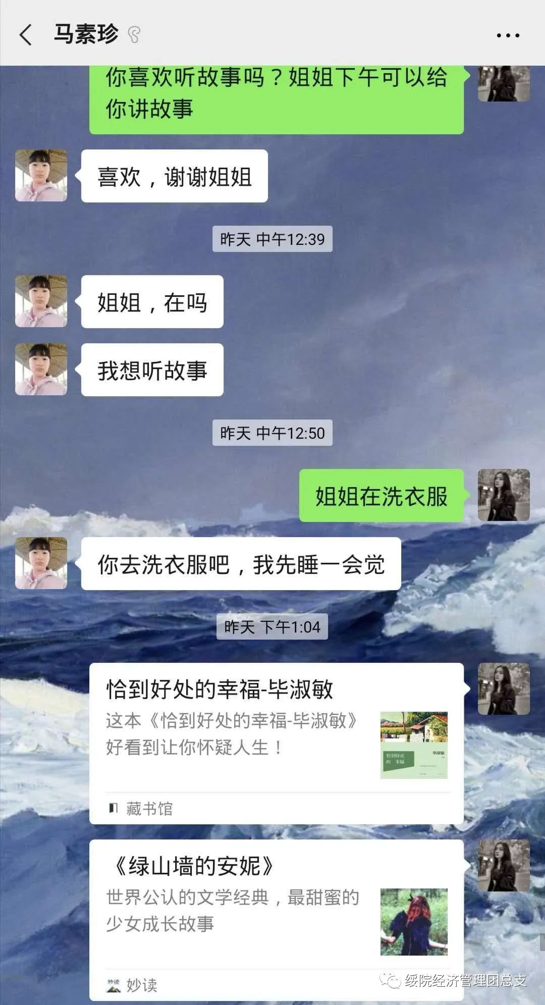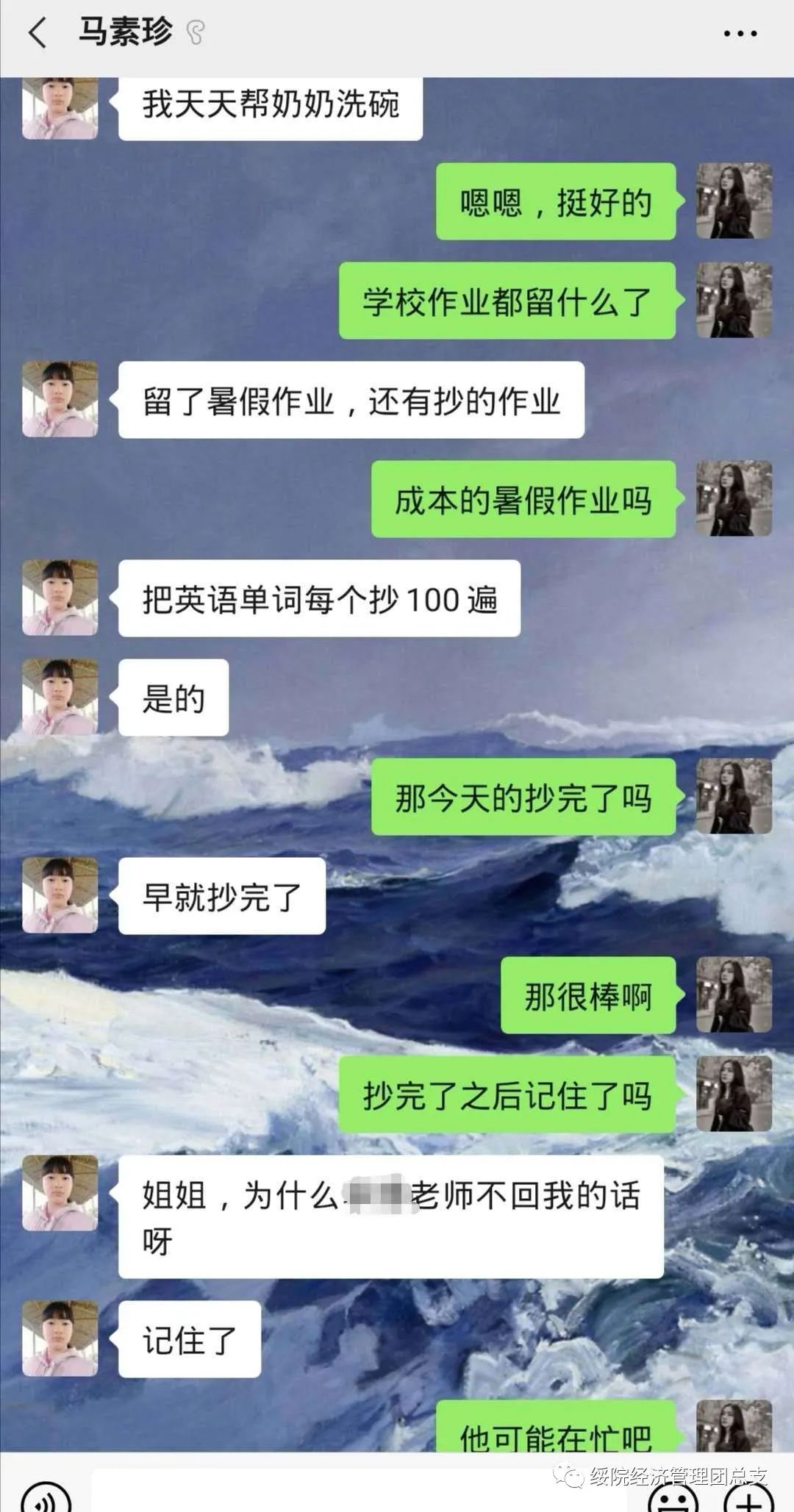 2019级旅游管理二班的翟贞莹同学耐心的与马素珍、仇恒宇交谈,询问他们的家庭情况以及生活环境,用温柔的话语时时刻刻关心他们的生活、悉心了解他们的喜好。翟贞莹同样关注他们的学习,给他们讲解学业上的疑难习题,也总是会询问他们作业的完成情况、对知识的困惑等。她认认真真的给马素珍和仇宇恒准备了地理课程辅导,每次她辅导之后,他们都会甜甜的说一句“谢谢姐姐”。翟贞莹无微不至的关怀是对马素珍、仇恒宇最美的爱护,无时无刻的陪伴更是填补了心中缺失的爱。