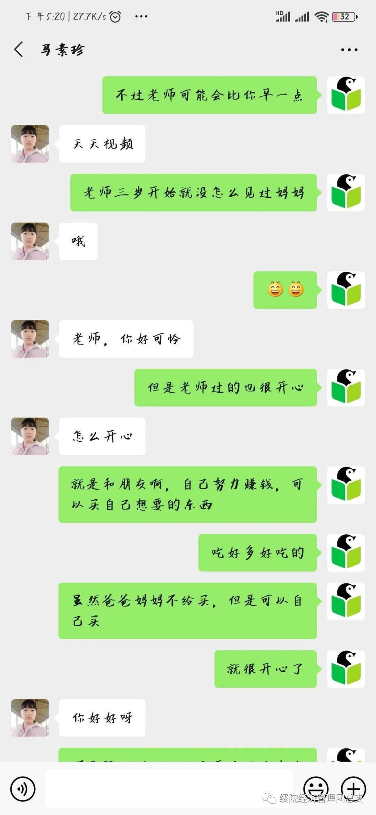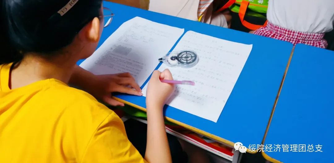 2019级旅游管理二班的李博同学为留守儿童开设相应的学习课程、制定详细的学习计划,面对她充满活力的笑脸,一双渴求又透露坚定的眼神,他细致的解答马素珍在学习中的问题,并且在学业上给予她最大的辅导。李博在和马素珍的聊天中了解到因为父母常年不在身边陪伴导致她有些许自卑,李博便用自己的经历告诉她:“要做好自己,和别人相比的是自身的能力,而不是家庭”。他的话语如春风般一字一句敲打着马素珍的心门,抚平了心底的伤痕,走出了心底的阴影。
