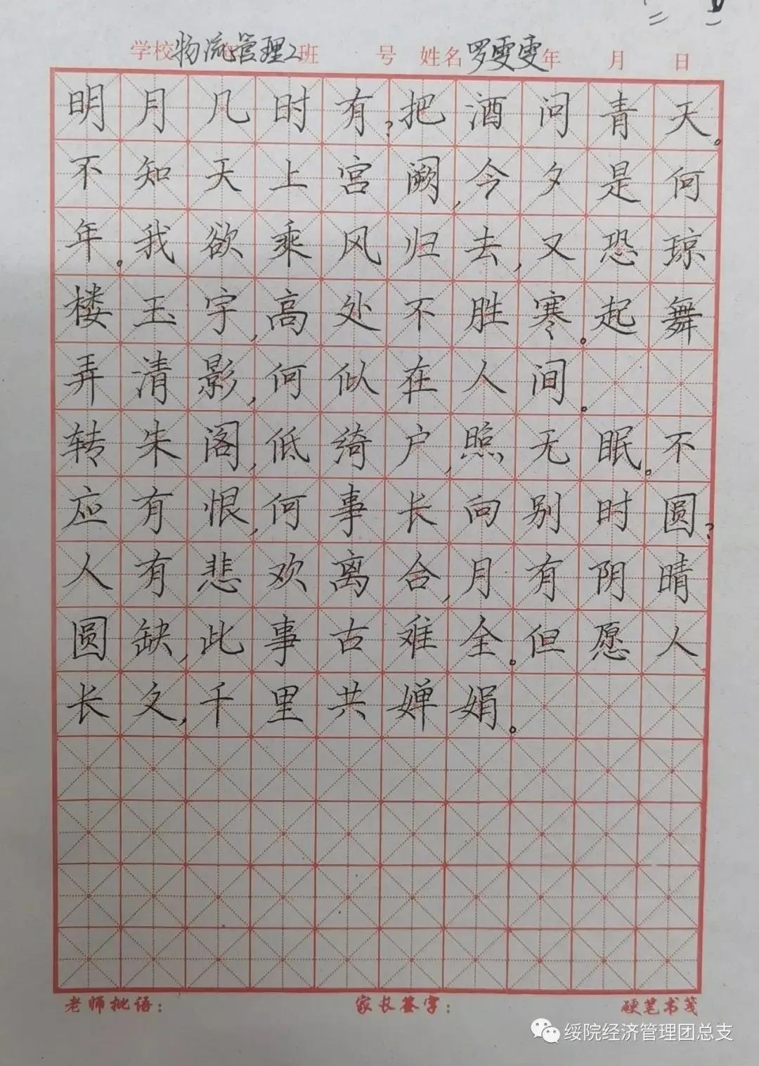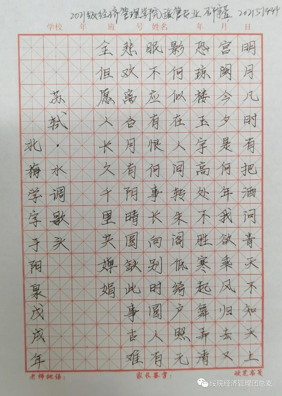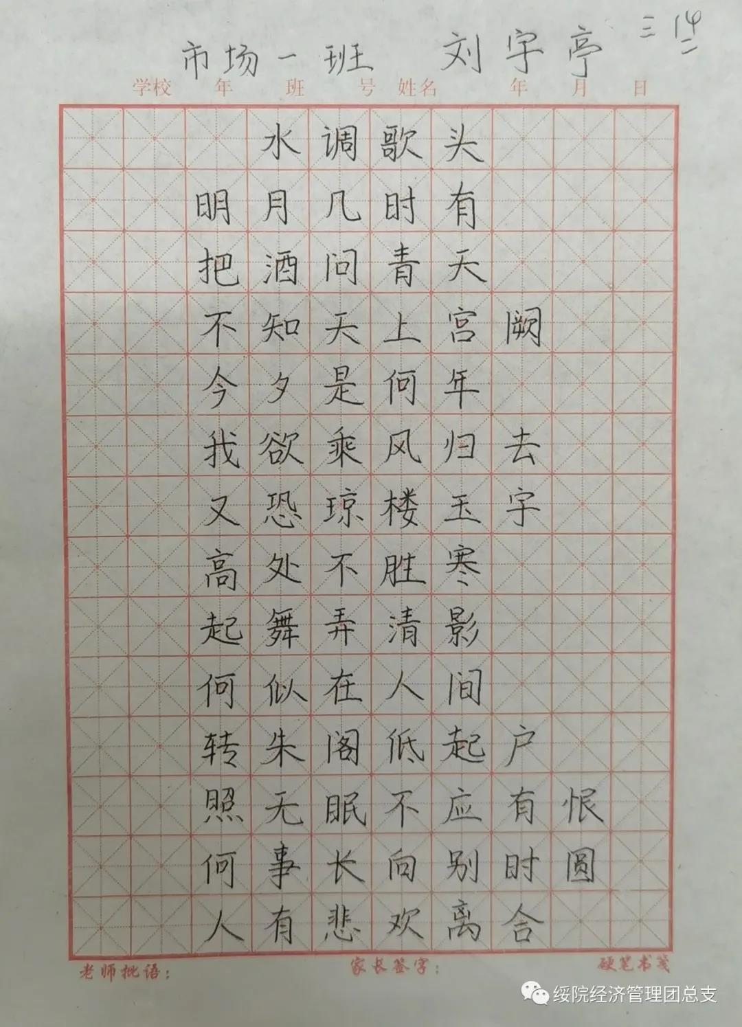 评委从书写规范、字迹大小,整体效果三个方面进行评比。最终,保险学二班王雪宁荣获一等奖,物流管理二班罗雯雯、保险学二班闫潼获得二等奖,财务管理三班赵宇曻、市场营销一班刘宇亭、旅游管理二班邵宇萱获得三等奖。