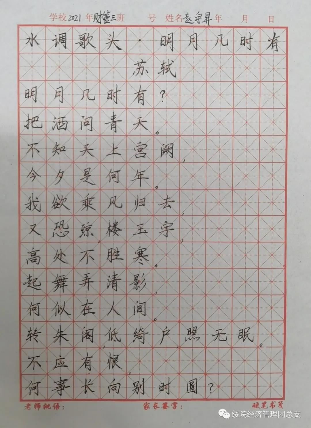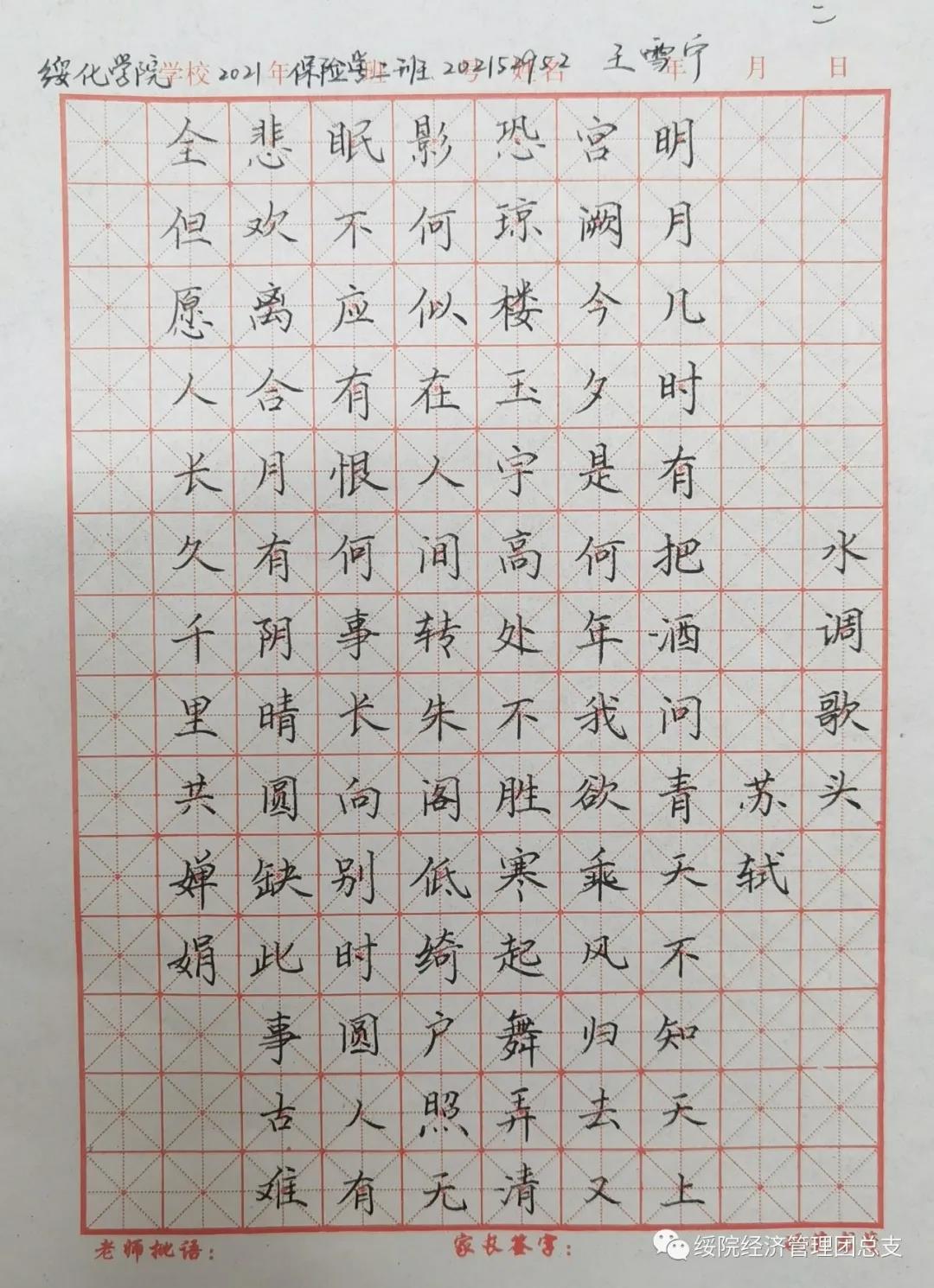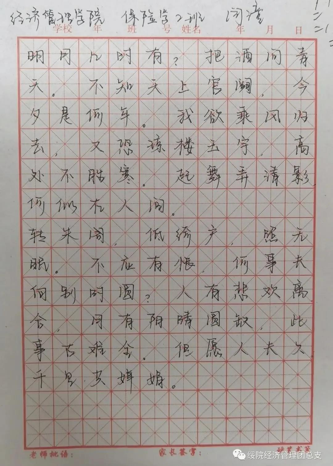 评委从书写规范、字迹大小,整体效果三个方面进行评比。最终,保险学二班王雪宁荣获一等奖,物流管理二班罗雯雯、保险学二班闫潼获得二等奖,财务管理三班赵宇曻、市场营销一班刘宇亭、旅游管理二班邵宇萱获得三等奖。
