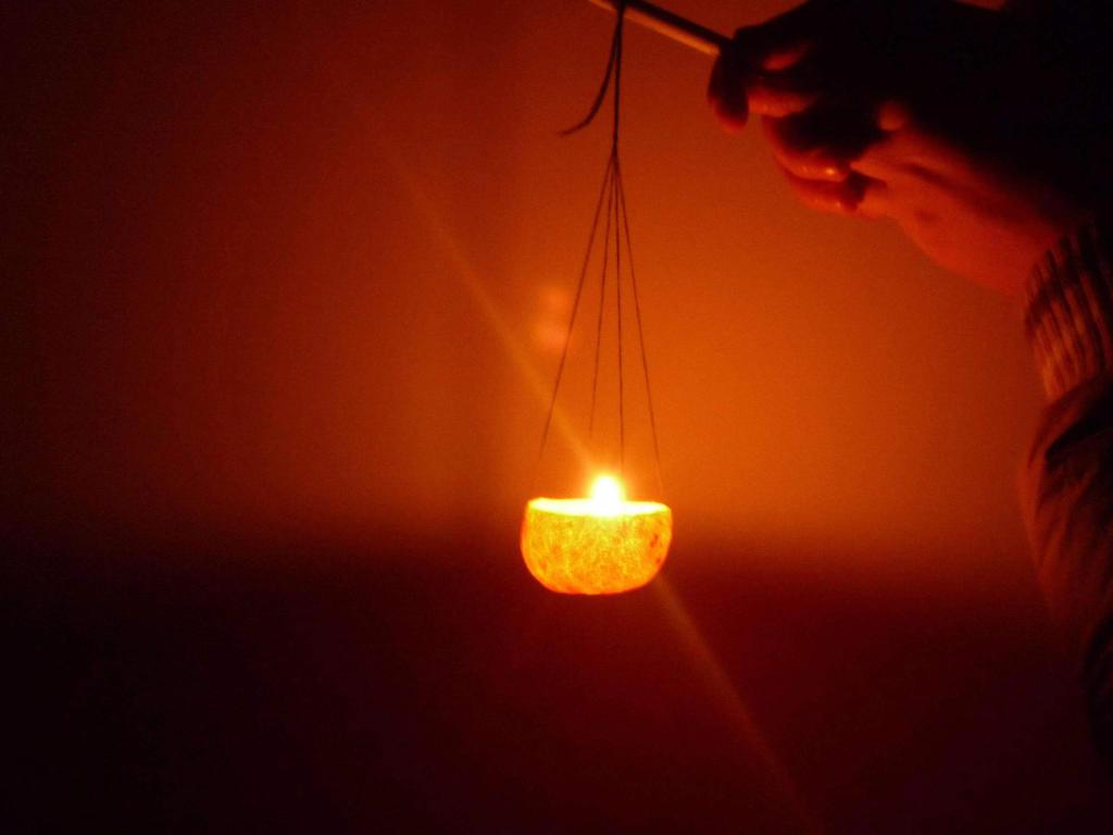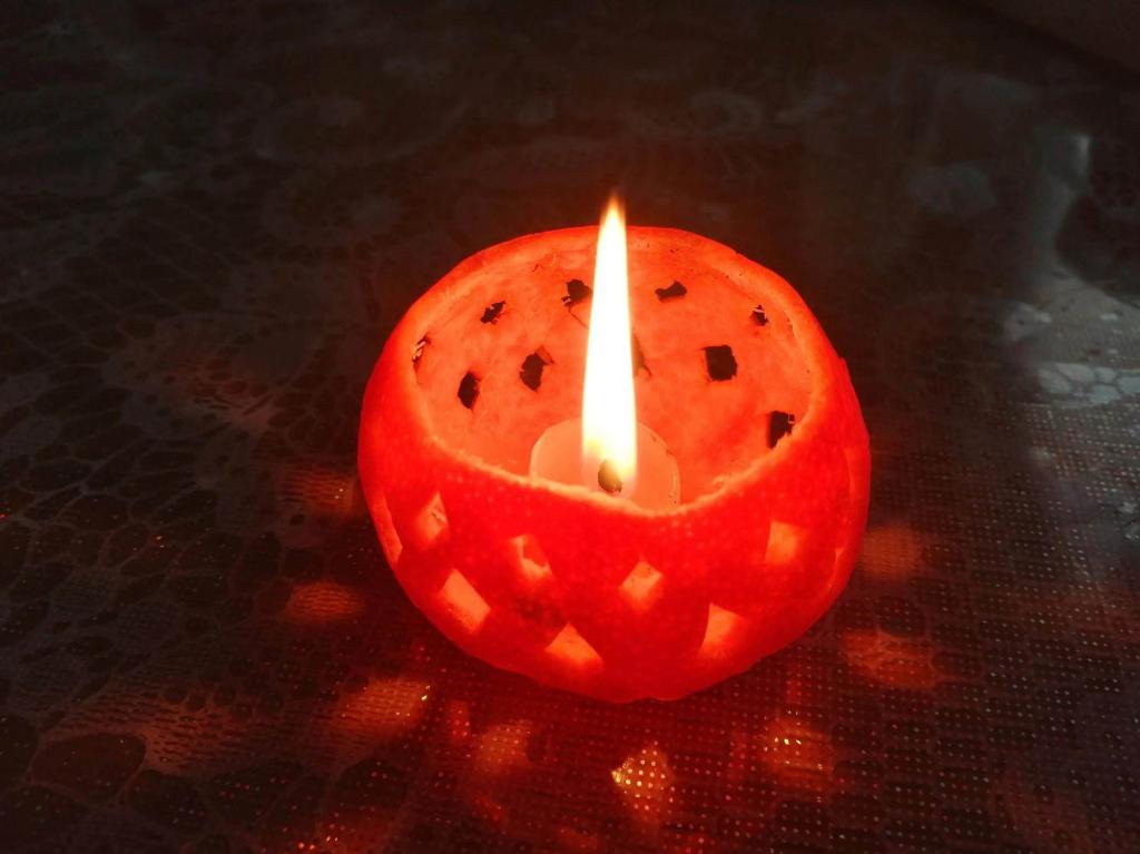 中秋之夜,家人团座,大人赏月,小孩玩灯,丰收的季节让我们一起学做橘皮灯吧!首先,我们要切掉橘子顶部的盖子,掏空橘子瓤掏出果肉,根据自己的喜好小心在橘皮上刻出花纹,接着,用刀在吸管和桔子两侧开孔,将绳子穿进桔子和吸管内,打结固定在桔子内,最后点上蜡烛,就制作完成了一盏小橘灯!