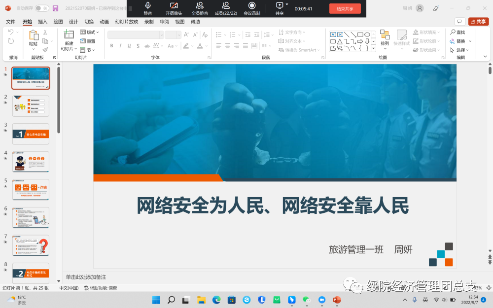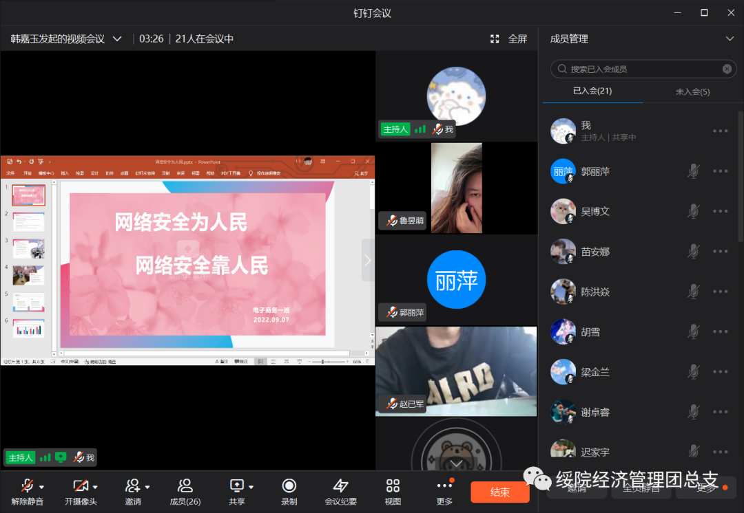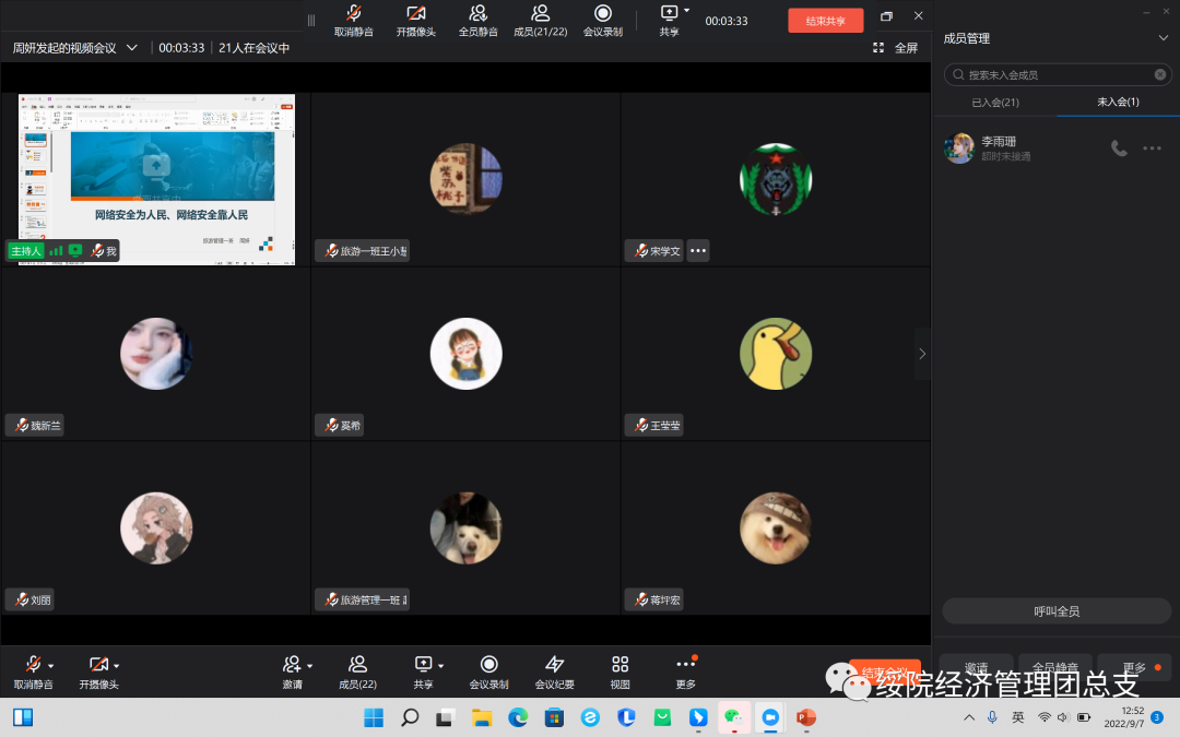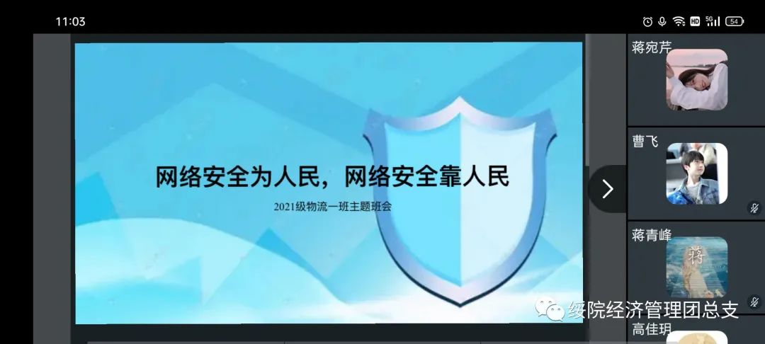 活动伊始,各班级负责人组织开展线上网络安全主题班团会,同学们就如何增强网络安全意识、文明使用网络语言、警惕网络诈骗等问题展开讨论。本次主题班团会,通过分析网络诈骗、信息窃取、网络谣言等案例,宣传讲解网络安全知识,引导员工文明上网,全面提高了员工的道德意识与网络安全意识。