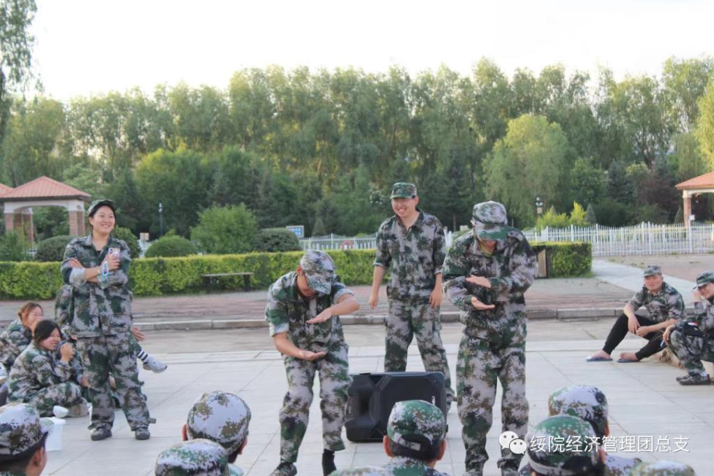 看!那是一连和二连的同学们聚在一起正在进行小型拉歌比赛,开来是昨天的比赛不过瘾,这不又在自己的连队里举办起来了。“圆头圆脑圆肚皮,里面是生命的真谛。”先上场的同学演唱了一首儿歌,将同学们带回到了小时候在电视机前守着看动画片的日子。接着我们的“歌王”管思博演唱了《你曾是少年》,引起了全场的合唱,悠扬婉转的旋律萦绕在联通广场上空。要说最会整活的还当属我们四连,这不都给我们表演上了话剧《白雪公主》,同学们围坐在一起观看着这场表演,虽然是临时起意的表演但是演员之间的默契早已在这几天的军训中培养了出来,当女演员问出“魔镜魔镜,告诉我谁是最美的女人”时,我们的“魔镜”用夸张生动的表情回答着“当然不是你喽~”引得全场笑声不断。四连的同学们用他们的方式为自己平淡乏味的军训生活增添色彩,原本腼腆含蓄的同学被带动了起来,在这几天交到了不错的朋友,同学之间的友谊也因为这场军训变得越来越牢固。