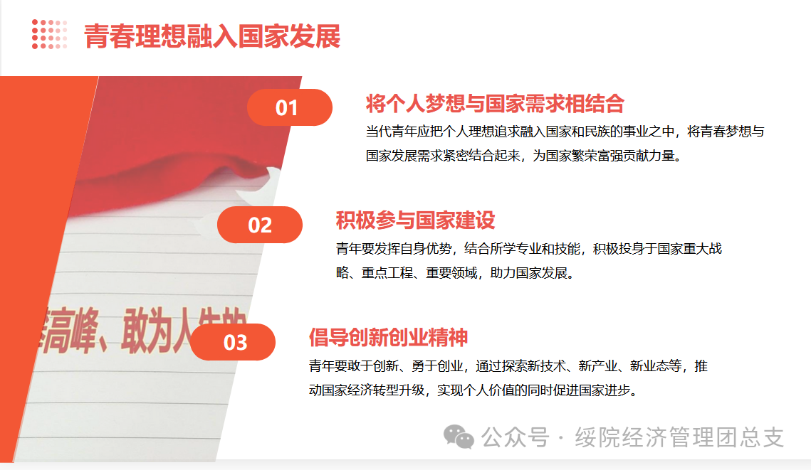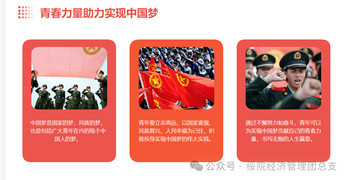 此次团课围绕两方面展开分别是将青春理想融入国家发展以及让青春力量助力实现中国梦。在活动开展过程中,董秋学带领大家学习青年一代对于国家发展和中国梦实现起到的重要作用。青年一代是国家发展的中坚力量。他强调青年一代要树立远大理想,积极参与国家建设,要将个人梦想和国家需求紧密结合到一起,为国家的繁荣富强作出贡献。接着,董秋学通过分享一系列真实故事和案例,向同学们展示出青年在国家发展起到的重要作用,展现出了青年在推动社会进步和中国梦实现的活力和创新精神。青年们通过自身的努力和实际行动为国家的发展和进步助力。同时,他还强调到青年要以国家富强,民族复兴,人民幸福为己任,通过不懈努力和奋斗为实现中国梦贡献力量,书写人生华章。