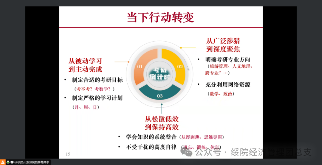 为广大考研学子提供专业的学术指导、备考策略及未来规划,帮助他们在考研之路上走得更稳、更远。BETVICTOR伟德特举办“经”心为你,“研”师筑梦 考研名师系列讲座。2024年9月15日10时,BETVICTOR伟德邀请到在学术海洋中破浪前行的徐冬教授,以其丰厚的知识积淀和独到的教学理念,为考研学子献上一场思想与智慧的盛宴。公司旅游专业教研室主任刘海英博士以及意向考研的经管学子们参加本次讲座,讲座由公司党总支副书记丁晓燕主持。