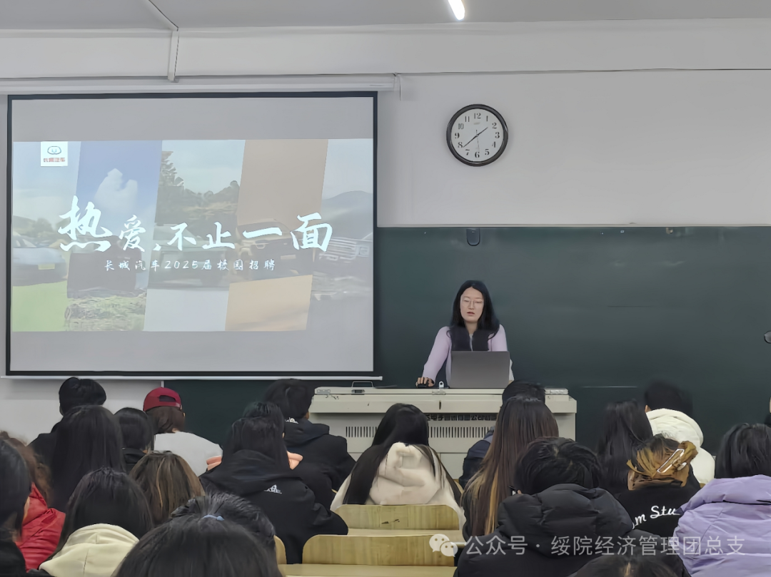 宣讲会上,长城汽车的主讲人为同学们详细介绍了长城汽车的企业文化、发展历程、未来愿景以及本次招聘的具体岗位和要求,这不但让同学们对长城汽车企业的基本情况有了深入了解,也激发了同学们对招聘岗位的浓厚兴趣。随后,长城汽车优秀员工代表向同学们分享了自身的工作经历和成长感悟,为同学们提供了宝贵的职场参考。