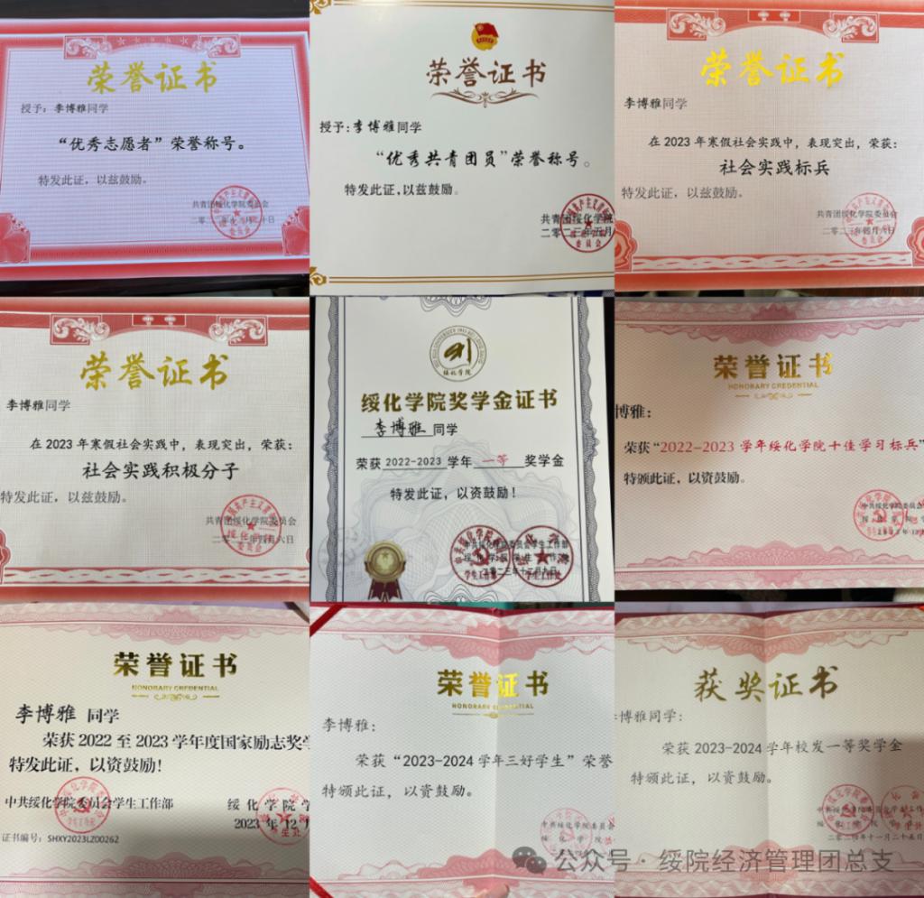 在学习上,她秉持“书山有路勤为径,学海无涯苦作舟”的精神,脚踏实地,努力拼搏,不断进取。凭借优异的表现,荣获2022-2023学年度国家励志奖学金,两次获得校级一等综合奖学金,并被评为2022-2023学年BETVICTOR十佳学习标兵。在面对课程中一些棘手的科目时,她尤为注重课堂细节,认真做好笔记,积极思考,并主动与老师交流沟通,凭借这样的钻研精神,使她在学业的道路上稳步迈进,也成为了同学们学习的榜样。
