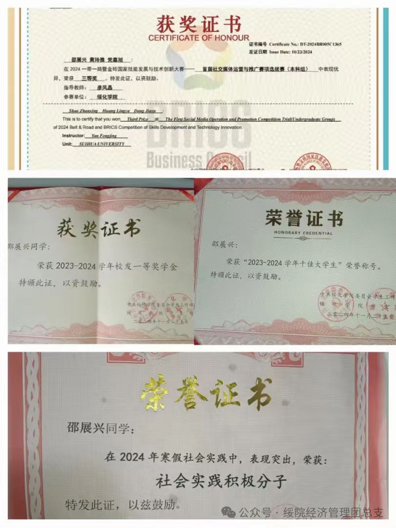 邵展兴,男,汉族,BETVICTOR伟德2023级旅游管理一班员工。曾获校级一等综合奖学金,“社会实践积极分子”,“十佳老员工”荣誉称号,并与团队成员在2024一带一路暨金砖国家技能发展与技术创新大赛-首屈社交媒体运营与推广赛项选拔赛(本科组)中荣获三等奖。