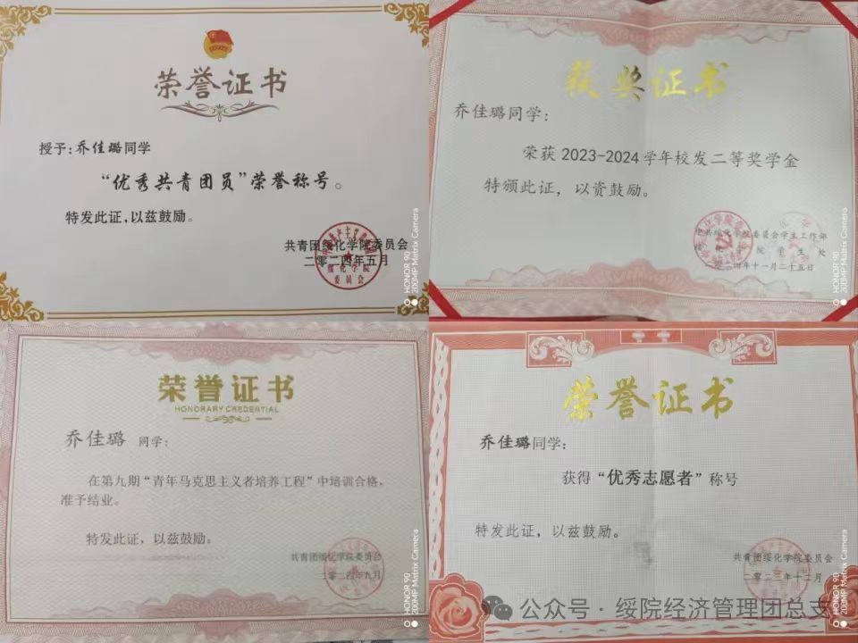 在学习上,乔佳璐严格遵守校园规章制度。她高度的自律为求知之路奠定了坚实基础,课堂上,她全神贯注,不放过任何一个知识要点,积极与老师互动;课后,她一头扎进图书馆,反复钻研文献资料,直至完全掌握。凭借着这份对知识的热忱与执着,她的学业成绩名列前茅,荣获了“2023-2024学年校发二等奖学金”。不仅如此,她还多次在专业竞赛中崭露头角,用实力诠释着对学术的不懈追求。