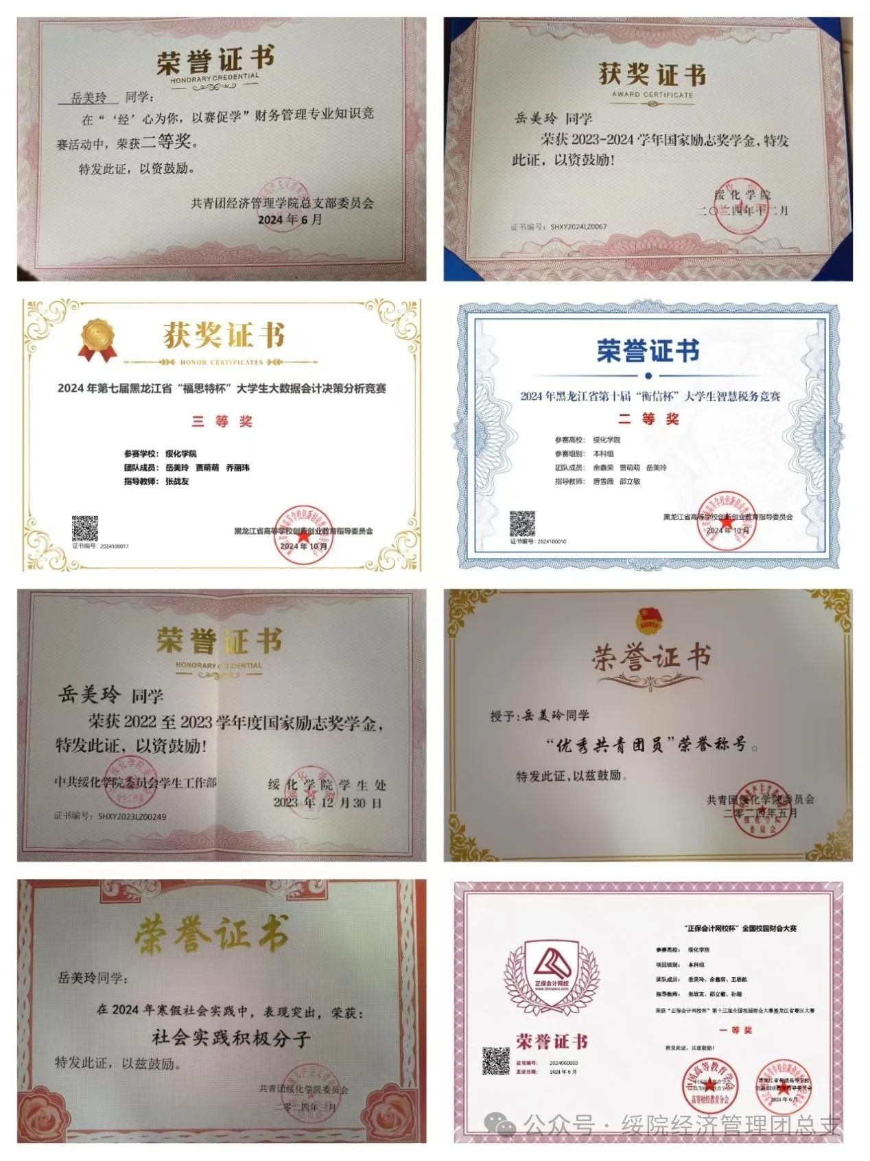 在生活上,岳美玲积极投身于各类志愿服务和社会实践活动,不断开阔自己的眼界,增加阅历,提升自身综合素质以及各方面的能力,在奉献中实现自我价值,在2024年度荣获"社会实践积极分子"称号,展现了当代青年将个人成长融入社会发展的责任与担当。