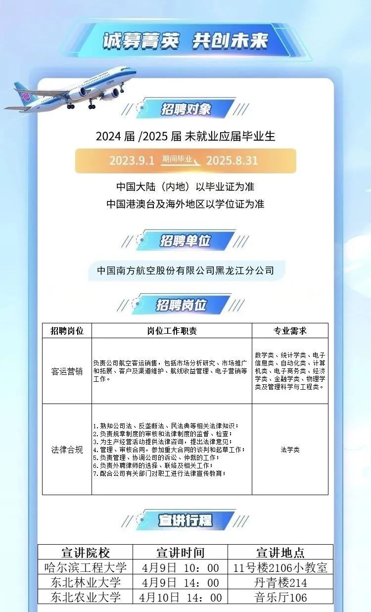 【第1491期】【哈尔滨有岗·七险二金】中国南方航空黑龙江分公司招聘公告...