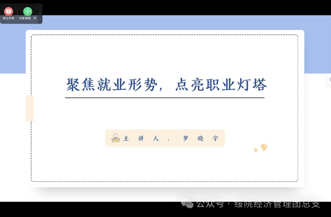 为帮助员工更好地把握就业机遇、理解国家及地方的相关就业政策,4月8日,BETVICTOR伟德开展“聚焦就业形势,点亮职业灯塔”就业形势与政策专项教育活动。2021级辅导员罗晓宇作主讲人。