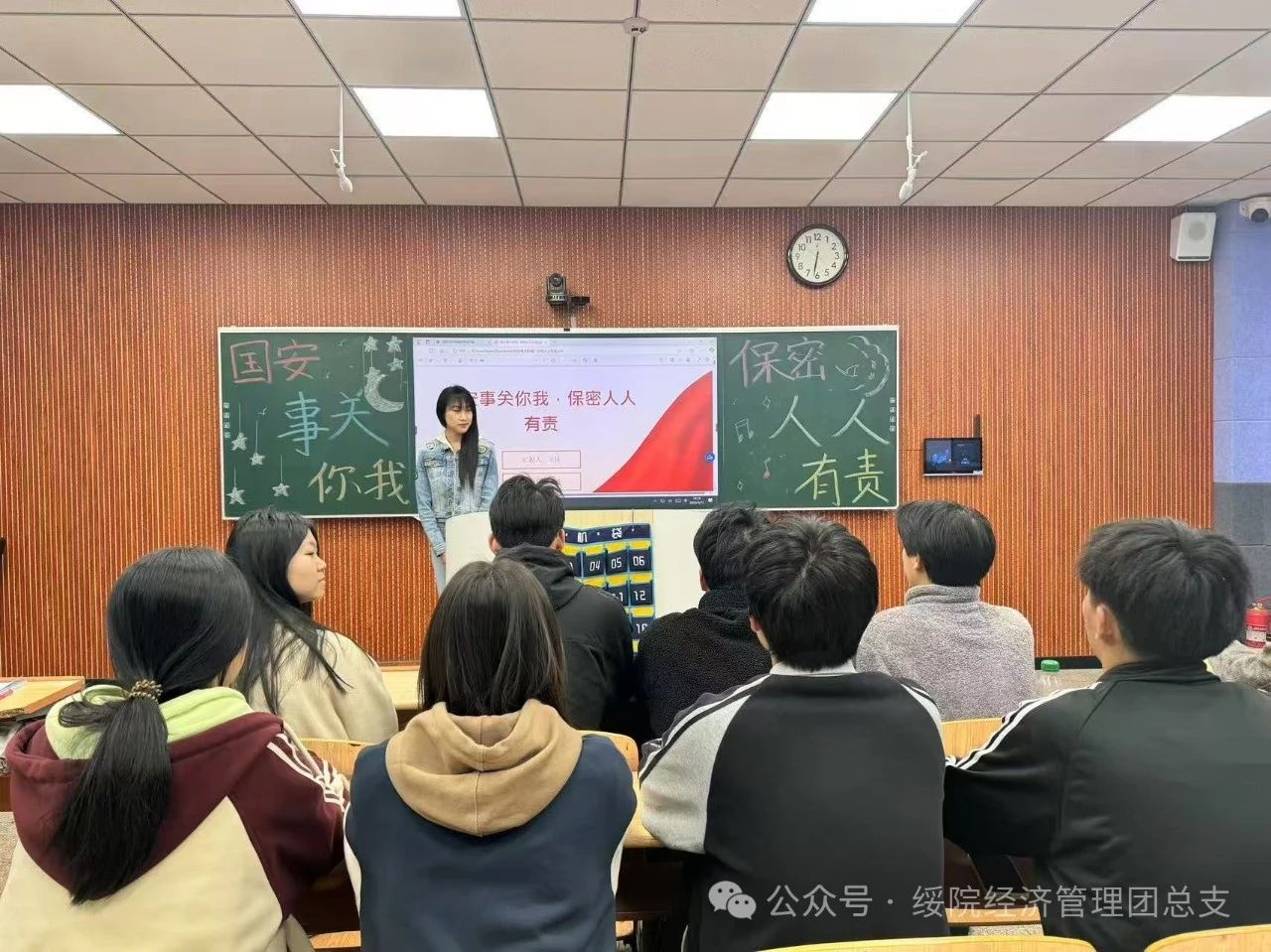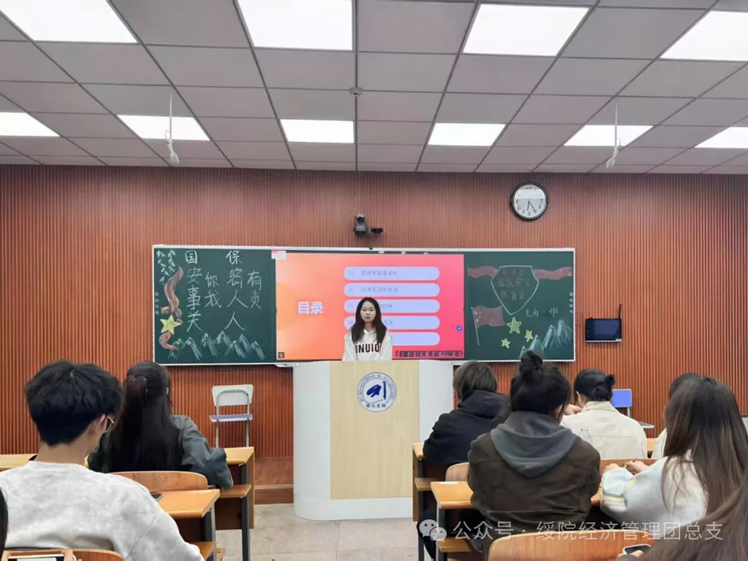各班级团支书借助PPT展示了因忽视保密工作导致国家利益受损的真实案例,让同学们清晰认识到维护国家安全与保密工作的重要性。随后,团支书围绕国家安全形势、保密法律法规、校园安全防范等内容展开讲解,阐明做好保密工作是筑牢国家安全防线的重要举措,并强调要将国家安全与保密知识入脑入心,把国家安全与保密意识融入日常点滴,以实际行动践行保密责任,成为国家安全的坚定守护者。此外,各班级团支书强调保密素养在就业与职业发展中也有着重要意义,员工要将国家安全和保密意识融入个人职业规划,树立正确职业价值观,在维护国家安全的同时实现自身职业理想。