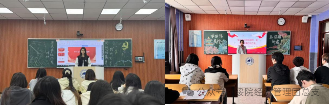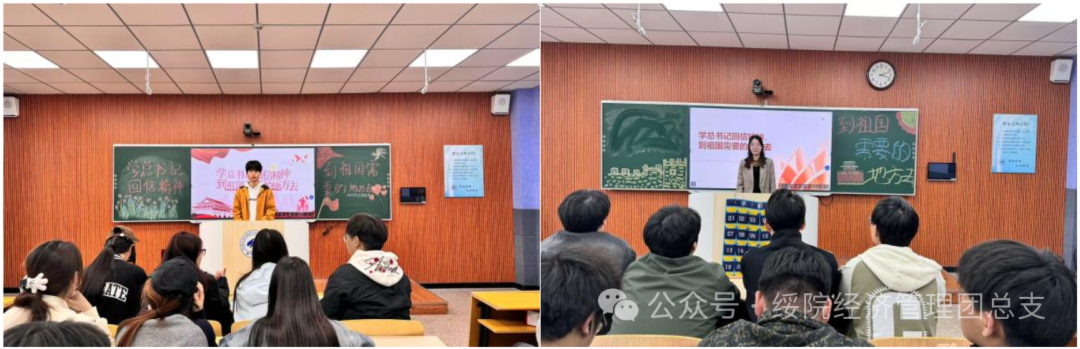 活动伊始,各班团支书带领同学们研读了习近平总书记的回信内容,深入剖析信中对青年一代的殷切期望与谆谆教诲,鼓励同学们要牢记习近平总书记的嘱托,在今后的学习和生活中积极践行回信精神。随后,各班级团支书借助PPT展示了优秀青年响应国家号召、投身基层建设的典型事迹,让同学们深刻感受到当代青年在祖国建设征程中勇担使命的精神风貌,也更加明晰青年学子应将奋斗足迹镌刻在祖国发展的壮阔征程之中,在服务社会中实现人生价值。