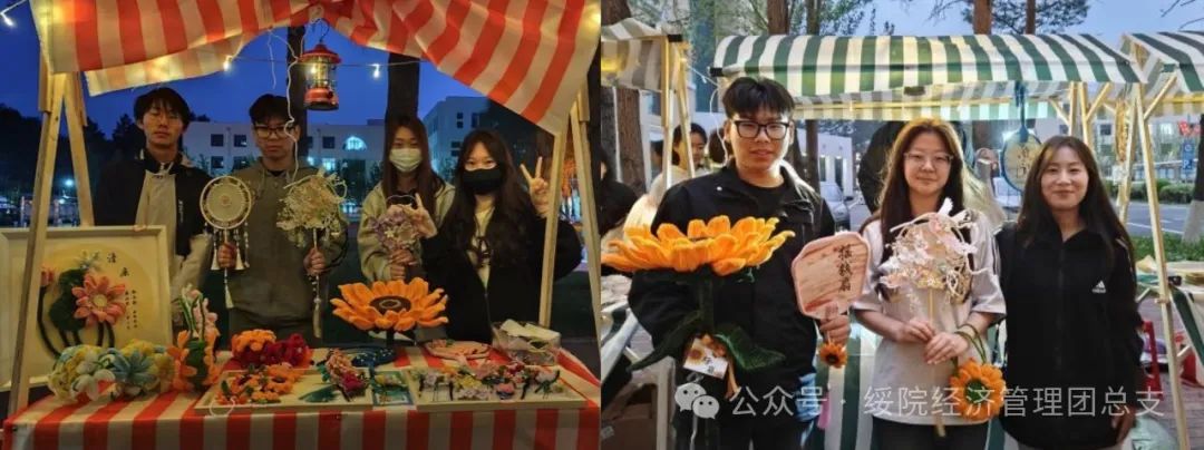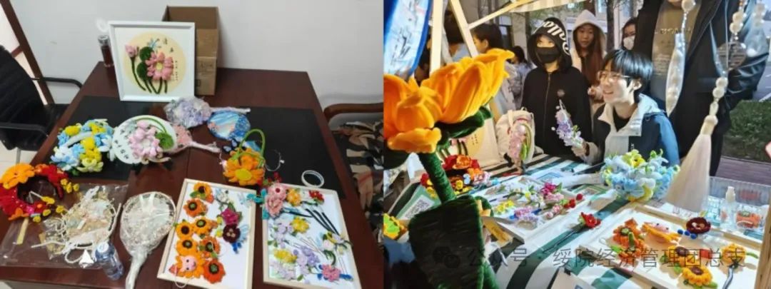 活动现场,“泽银的花花小世界”摊位布置精巧,针织向日葵、绒花饰品等手工作品色彩斑斓、造型各异,将艺术与创意完美融合,展现出参与者们丰富的想象力与精湛的手工技艺。项目负责人张伦博介绍道:“我们希望通过这些手工艺品,传递对生活的热爱与创意。”筹备过程中,团队成员不断尝试新的工艺与设计,从选材到制作,每一步都精益求精;市集上,他们热情地向师生介绍作品,耐心解答疑问,积极推广自己的创意成果,将课堂上学到的营销、管理等知识运用到实践中。其他团队成员们表示,此次创意市集收获了创作的乐趣、实践的经验,还增强了团队协作和创新创业意识。