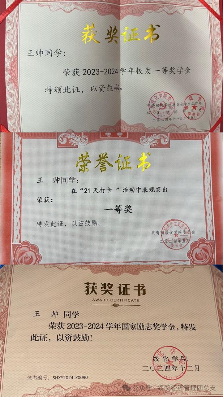 在思想上,王帅同学时刻以高标准要求自己,主动学习党的理论知识,积极参与各类思想政治教育活动,时刻牢记习近平总书记对青年的教导,怀抱梦想又脚踏实地,立志做一名有理想、敢担当、能吃苦、肯奋斗的新时代好青年。