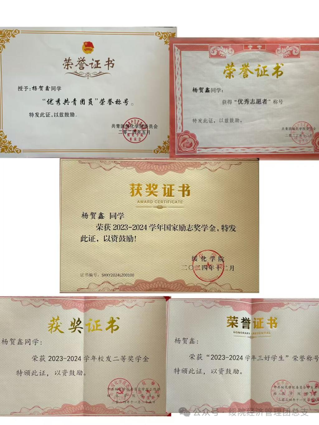 在学习上,杨贺鑫同学始刻苦钻研、态度认真,目标明确,主动积极地配合老师教学,认真预习并完成各科作业。凭借着扎实的专业基础和积极向上的学习态度,使她取得了优异的成绩。