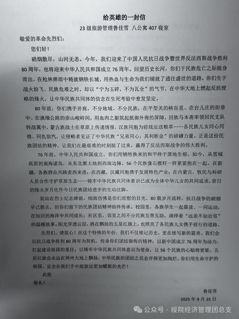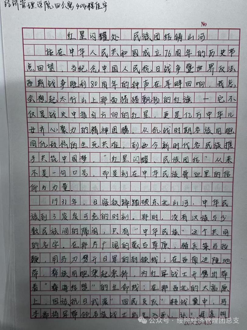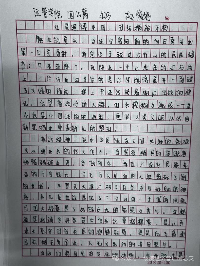 本次征文比赛得到全院员工的积极响应与广泛参与,员工们围绕“红星闪耀、民族团结”核心主题,将历史与现实交融,用文字抒发对铸牢中华民族共同体意识的深刻思考,传递弘扬抗战精神的坚定信念。参赛作品中,既有对革命先辈坚守信仰、奋勇抗敌的深情缅怀,也有对当代各族青年携手共进、共筑复兴梦的生动描绘,充分展现了经管学子传承抗战精神、凝聚民族力量的责任担当。